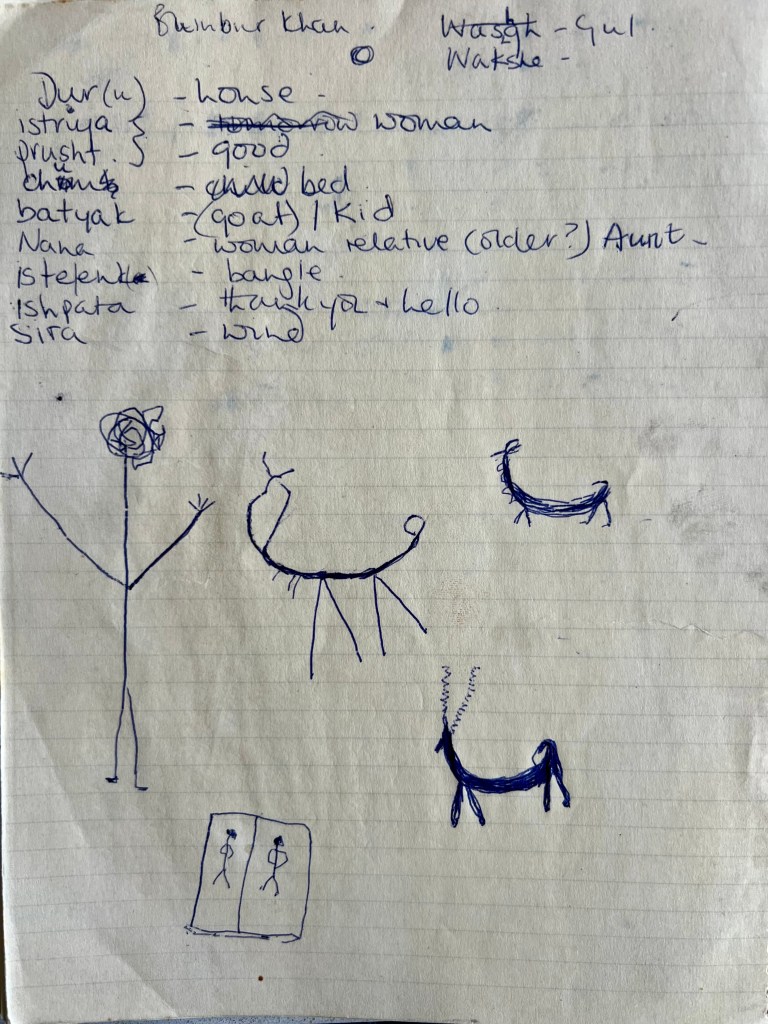 Later we went down into the village, brought some lemon creams and washed in the river. Saw a Kalash girl washing and platting her hair. Back at Bumbur Khan‘s house we sat in front and were soon surrounded by curious Kalash women – one even taught me my first words of Kalash. Others drew pictures in the back of this book.