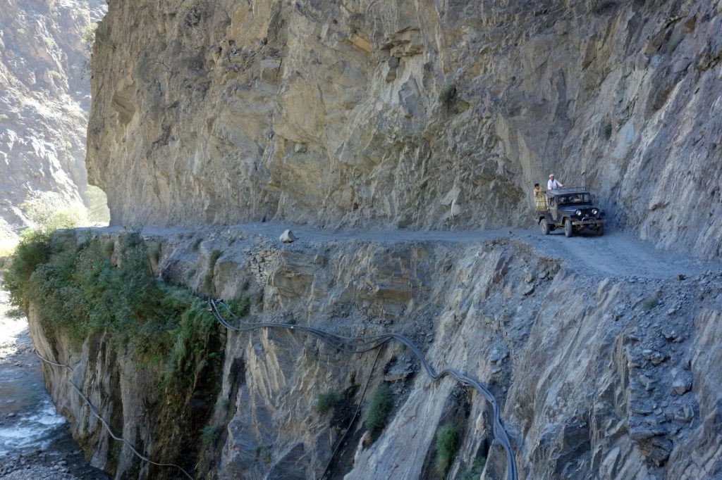 We woke up 5 and the old man, Mir Badja, brought us boiled eggs, tea and bread. Tirich Mir looked fabulous in the early morning sunlight, looming straight in front of us. Our guides arrived just after 6 and we walked to the upper half of the village, which we never knew existed, where the guide loaded up a tiny, charming donkey – even put our sleeping stuff on it. Then off we went, at a fair pace up, up, up on winding hairpin roads.