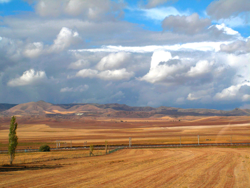 Got up to the sound of rain on a tin roof, but by the time we were ready to leave it had cleared up and the sun was shining. We found a bus going to Niğde – took 4 1/2 hours through mountain passes, steep gorges – very beautiful, very Anatolian in its desolation – lots of sheep and newborn white woolly lambs. At Niğde we had a köfte sandwich made with unleavened bread, and then got on a half-size bus to go to Nevsehir.